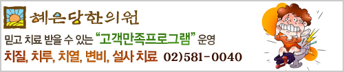 "고객만족프로그램"이란 말 그대로 환자분들이 혜은당 한의원에 대한 신뢰를 가지고 치료에 적극적으로 임하실 수 있도록 만든 환자분과의 약속입니다. 혹시라도 낫지 않는 환자분들에 대해서도 책임지겠다는 의도로 만든 프로그램이니 참조하시기 바랍니다.
